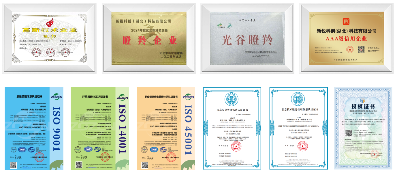 新銳科創(chuàng)獲得了20+項企業(yè)認(rèn)證,包括:高新技術(shù)企業(yè)、瞪羚企業(yè)、AAA級信用企業(yè)、ISO管理體系認(rèn)證等。