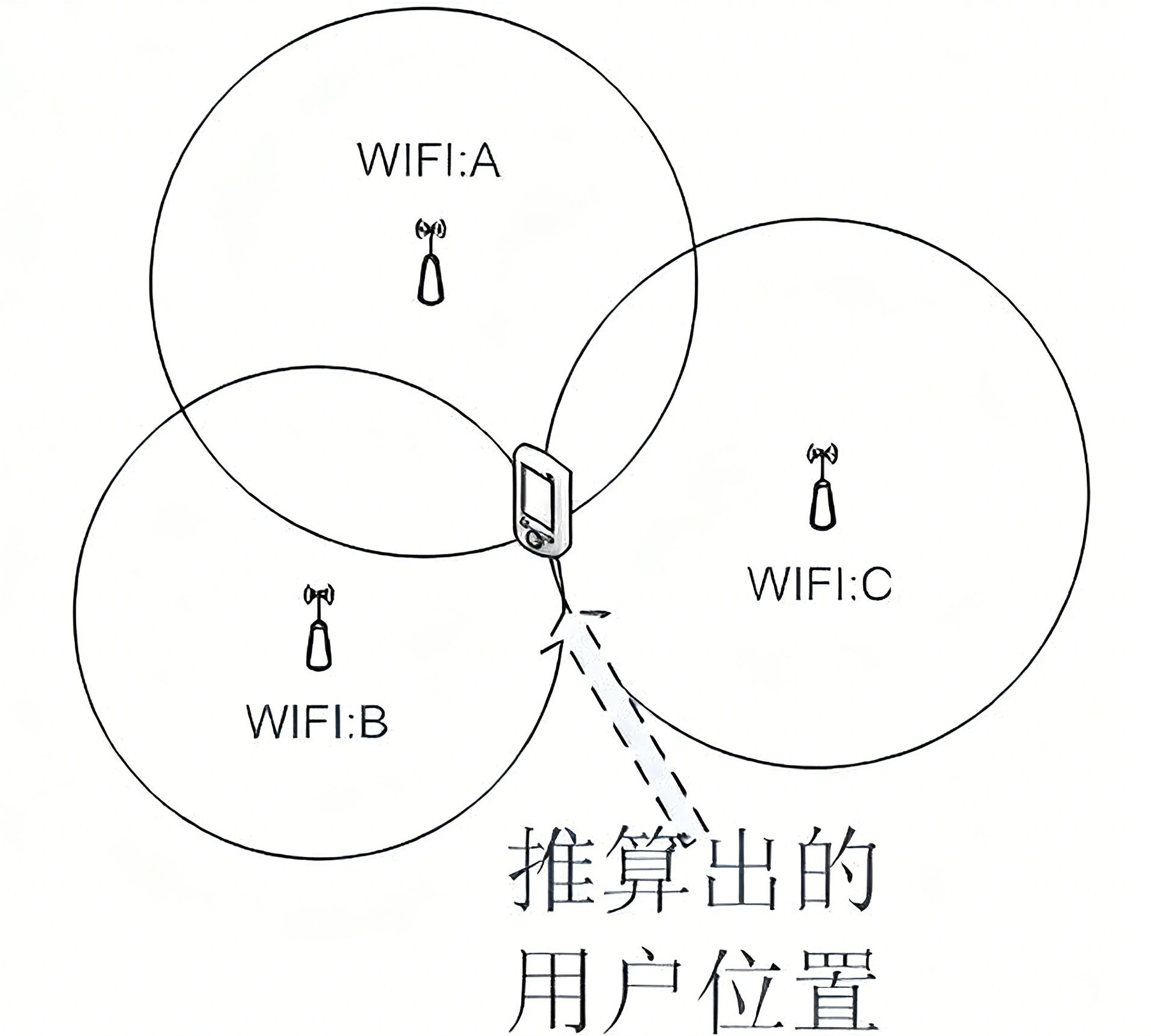 三角定位算法基于信號在空間傳播過程中的衰減特性,利用三個或更多AP掃描到同一終端信息,根據(jù)信號衰減公式及AP位置信息推算出終端位置。