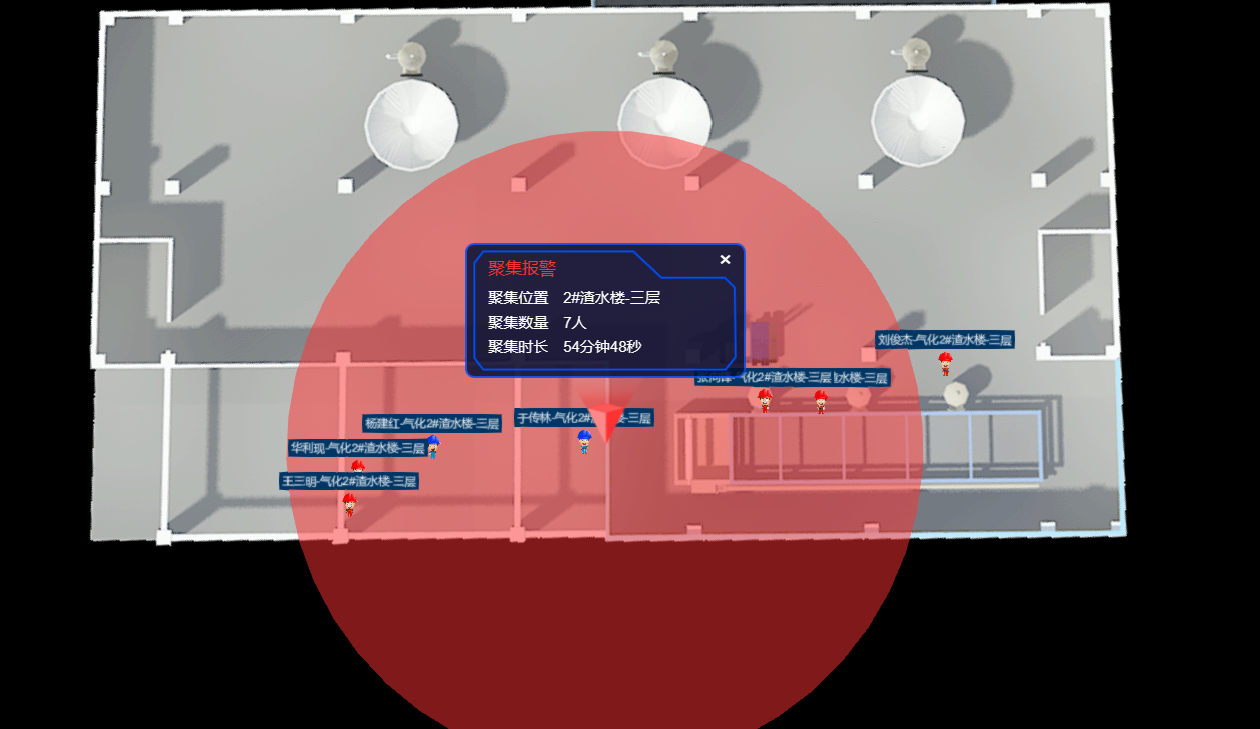 在電子地圖按工廠實際設置電子圍欄,如危險區域、限制進入區域等。人車進出圍欄區域,系統自動報警并通知管理人員。還可設置超員、缺員、車輛超速、長時間滯留等預警規則,異常情況及時報警。