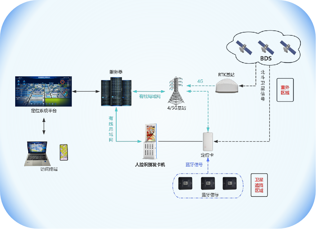 對(duì)于礦坑底部、破碎車間、維修廠房等衛(wèi)星信號(hào)薄弱或完全遮擋的區(qū)域,低功耗藍(lán)牙技術(shù)形成了有效的補(bǔ)充覆蓋。系統(tǒng)在封閉空間內(nèi)合理部署藍(lán)牙信標(biāo),這些信標(biāo)以固定周期廣播無(wú)線信號(hào),與人員佩戴的定位標(biāo)簽或設(shè)備搭載的終端實(shí)時(shí)通信,通過(guò)信號(hào)強(qiáng)度測(cè)算實(shí)現(xiàn)精準(zhǔn)定位。藍(lán)牙技術(shù)的低功耗特性大幅延長(zhǎng)了設(shè)備續(xù)航周期,減少了頻繁更換電池的維護(hù)成本,同時(shí)其抗電磁干擾能力較強(qiáng),能在大型機(jī)械密集的環(huán)境中保持穩(wěn)定運(yùn)行。