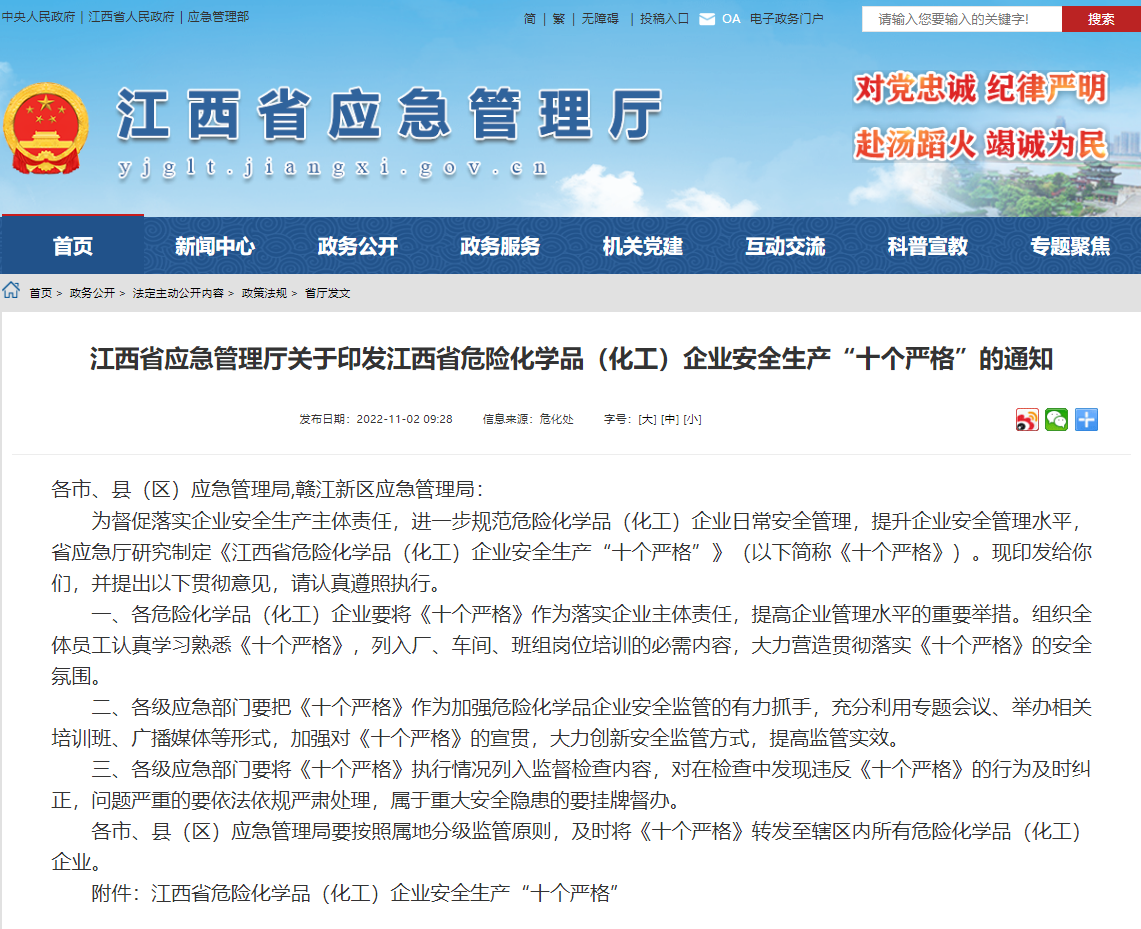 2022年11月2日,江西省應(yīng)急管理廳發(fā)布關(guān)于印發(fā)江西省危險化學(xué)品(化工)企業(yè)安全生產(chǎn)“十個嚴(yán)格”的通知。通知明確提出,各危險化學(xué)品(化工)企業(yè)要將《十個嚴(yán)格》作為落實(shí)企業(yè)主體責(zé)任,提高企業(yè)管理水平的重要舉措。