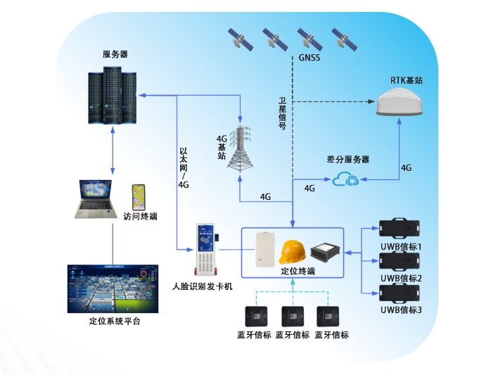 4G+藍牙+UWB+RTK人員定位系統拓撲圖: