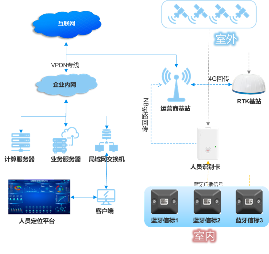 NB-IoT+藍牙+GPS/北斗RTK人員定位系統(tǒng)網(wǎng)絡(luò)拓撲圖如下: